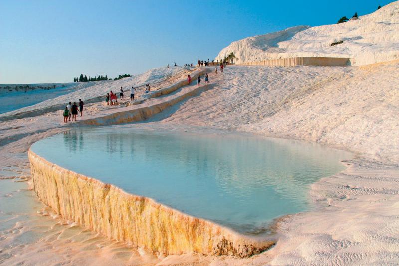 Στα τουρκικά «Παμούκαλε» σημαίνει «κάστρο από βαμβάκι» και η κατάλευκη εικόνα που αντικρίζεις δεν διαφέρει και πολύ απ' αυτό: σκαλισμένες από τη φύση στη διάρκεια αιώνων, οι κλιμακωτές ασβεστολιθικές πισίνες με θερμά ιαματικά νερά δημιουργούν ένα από τα δημοφιλέστερα αξιοθέατα της χώρας, που προστατεύεται από την Ουνέσκο ως Μνημείο Παγκόσμιας Πολιτιστικής Κληρονομιάς. Η περιοχή είναι διάσημη από την προ Χριστού εποχή για τα θεραπευτικά της λουτρά αλλά σήμερα μπορείτε να βουτήξετε μόνο έως τα γόνατα στις βάθρες (το μπάνιο επιτρέπεται στα οργανωμένα σπα της περιοχής) και να περιηγηθείτε στο εξωπραγματικό τοπίο αυστηρώς χωρίς τα παπούτσια σας. Δίπλα στο «χιονισμένο» Παμούκαλε ξεδιπλώνεται και ο πλούσιος αρχαιολογικός χώρος της Ιεραπόλεως (2 π.Χ. αι.) Βρίσκεται στην κοιλάδα του Μαιάνδρου, περίπου 20 χλμ. ΒΑ της πόλης Denizli (περίπου 650 χλμ. από την Κων/πολη).